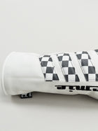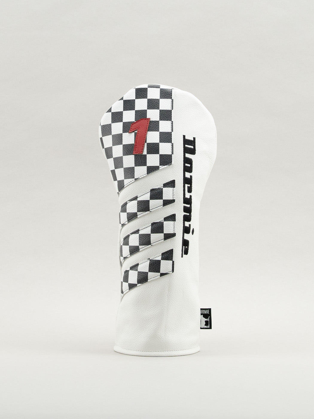 Crafted from premium Italian-printed checker leather, the cover mirrors the finish-line flag with bold contrast and movement. Racing stripes in puff appliqué stitch down the left — a nod to speed in motion — while a red leather #1 identifier marks your place at the front of the pack.
